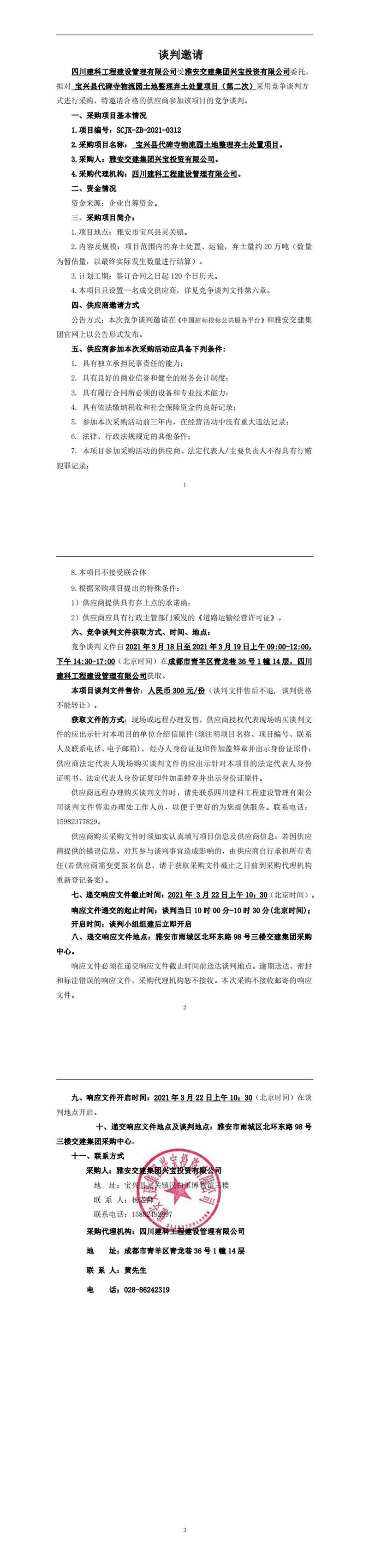 雅安交建集團興寶投資有限公司寶興縣代碑寺物流園土地整理棄土處置項目(第二次)競爭談判公告