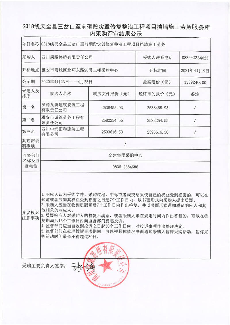 四川康藏路橋有限責(zé)任公司G318線天全縣三岔口至前碉段災(zāi)毀修復(fù)整治工程項(xiàng)目擋墻施工勞務(wù)服務(wù)庫內(nèi)采購評審結(jié)果公示