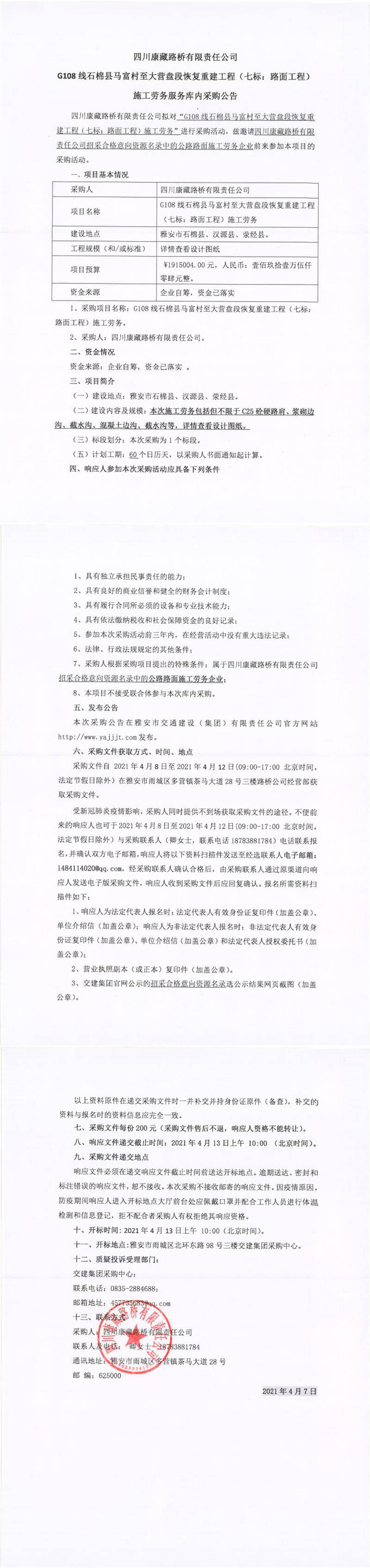 四川康藏路橋有限責(zé)任公司G108線石棉縣馬富村至大營(yíng)盤段恢復(fù)重建工程(七標(biāo):路面工程)施工勞務(wù)服務(wù)庫(kù)內(nèi)采購(gòu)公告