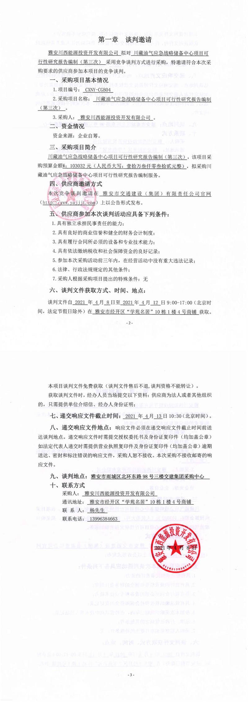 雅安川西能源投資開(kāi)發(fā)有限公司川藏油氣應(yīng)急戰(zhàn)略儲(chǔ)備中心項(xiàng)目可行性研究報(bào)告編制(第三次)競(jìng)爭(zhēng)談判公告