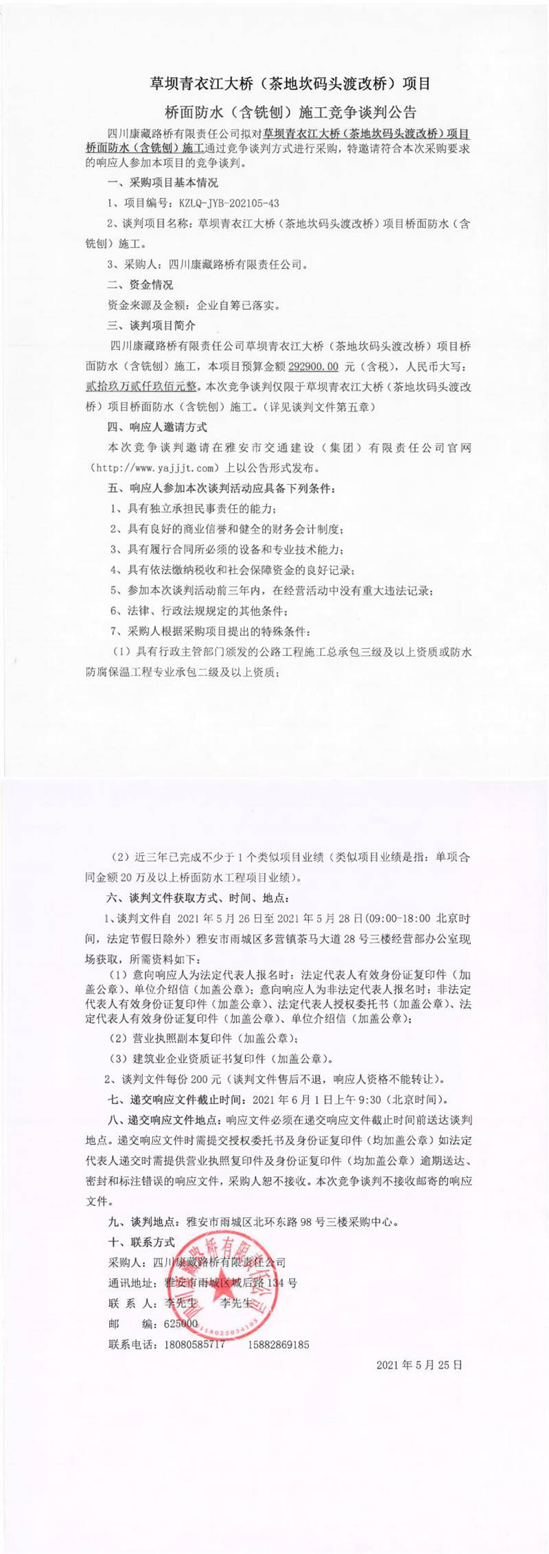 四川康藏路橋有限責任公司草壩青衣江大橋(茶地坎碼頭渡改橋)項目橋面防水(含銑刨)施工競爭談判公告