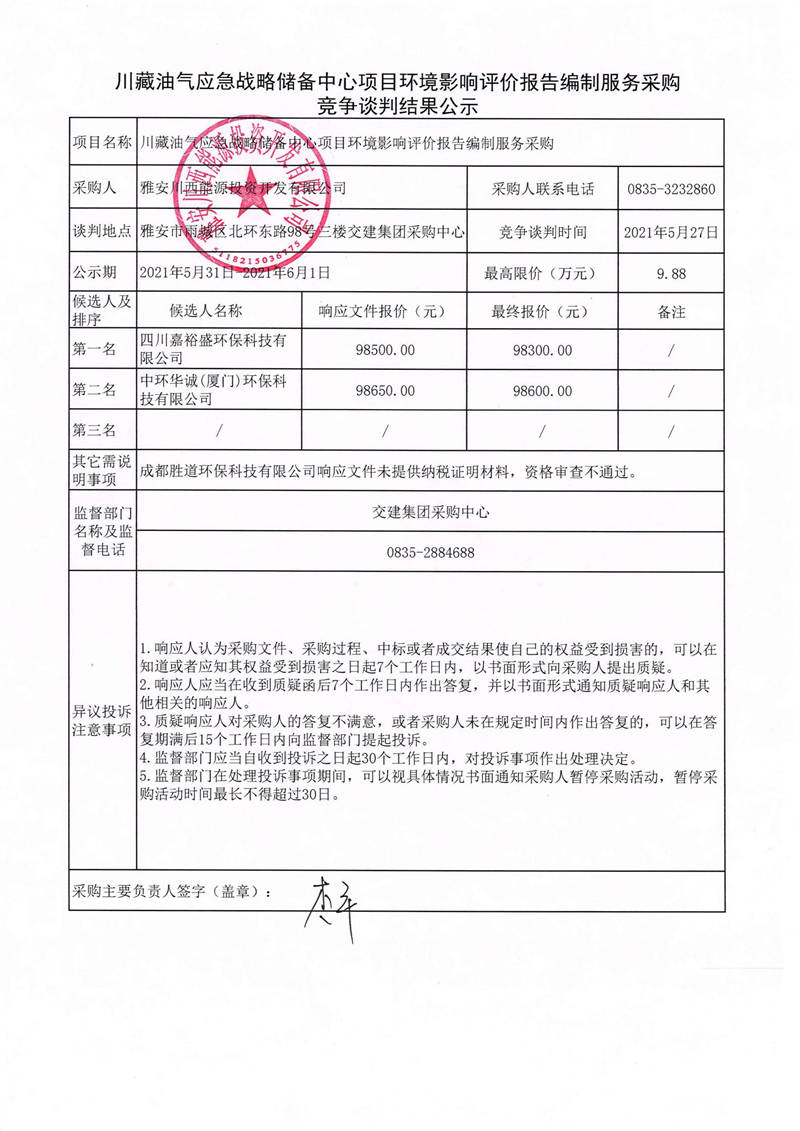 雅安川西能源投資開發(fā)有限公司川藏油氣應急戰(zhàn)略儲備中心項目環(huán)境影響評價報告編制服務采購競爭性談判結果公示