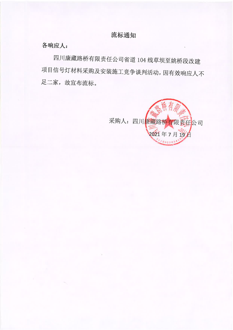 四川康藏路橋有限責(zé)任公司省道104線草壩至姚橋段改建項目信號燈材料采購及安裝施工競爭談判流標(biāo)通知