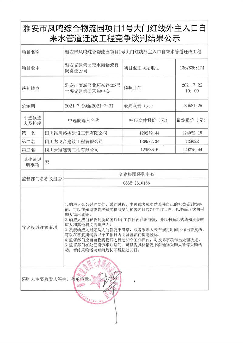 雅安交建集團(tuán)無水港物流有限責(zé)任公司雅安市鳳鳴綜合物流園項(xiàng)目1號(hào)大門紅線外主入口自來水管道遷改工程競爭談判結(jié)果公示