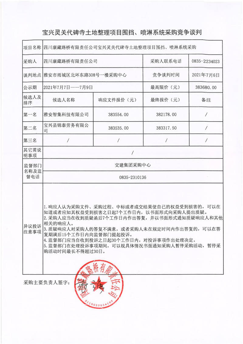 四川康藏路橋有限責(zé)任公司寶興靈關(guān)代碑寺土地整理工程項(xiàng)目圍擋、噴淋系統(tǒng)采購競爭談判結(jié)果公示
