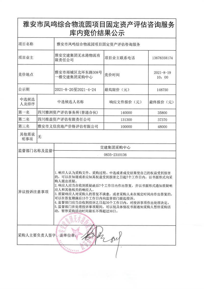 雅安交建集團(tuán)無水港物流有限責(zé)任公司雅安市鳳鳴綜合物流園項(xiàng)目固定資產(chǎn)評(píng)估咨詢服務(wù)庫內(nèi)競(jìng)價(jià)結(jié)果公示