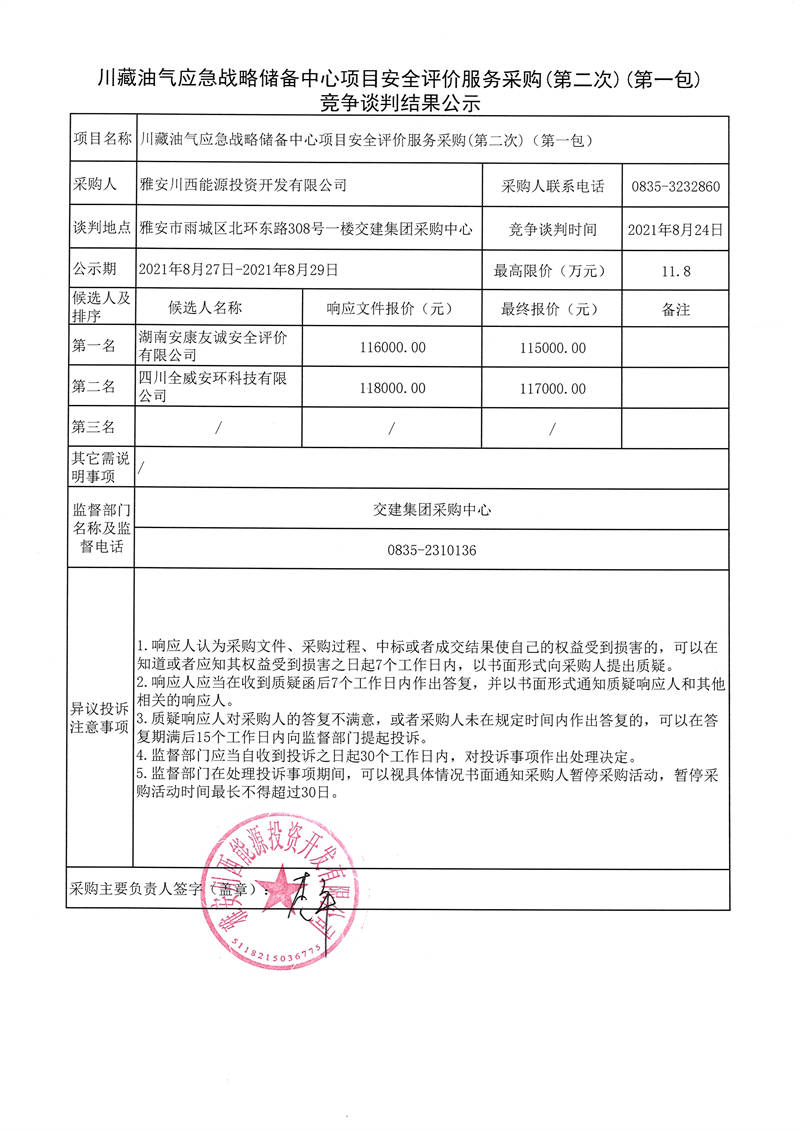川藏油氣應(yīng)急戰(zhàn)略?xún)?chǔ)備中心項(xiàng)目安全評(píng)價(jià)服務(wù)采購(gòu)(第二次)(第一包、第二包)競(jìng)爭(zhēng)談判結(jié)果公示