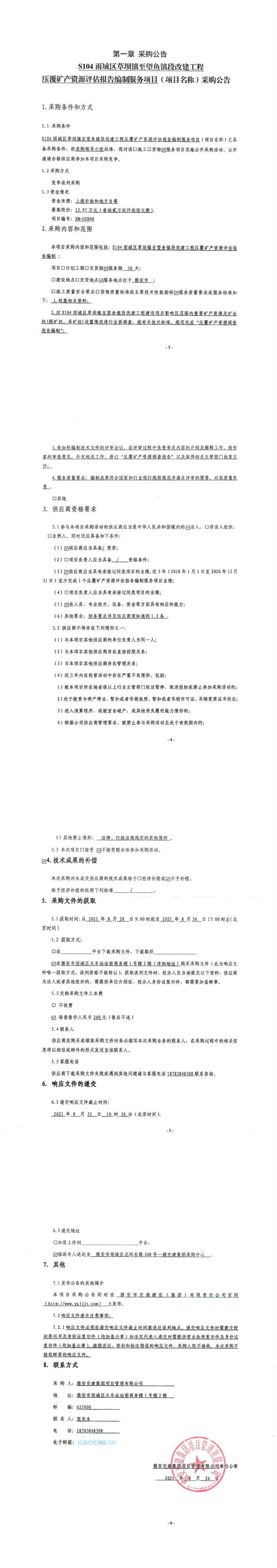 雅安交建集團項目管理有限公司S104雨城區(qū)草壩鎮(zhèn)至望魚鎮(zhèn)段改建工程壓覆礦產(chǎn)資源評估報告編制服務(wù)項目采購公告