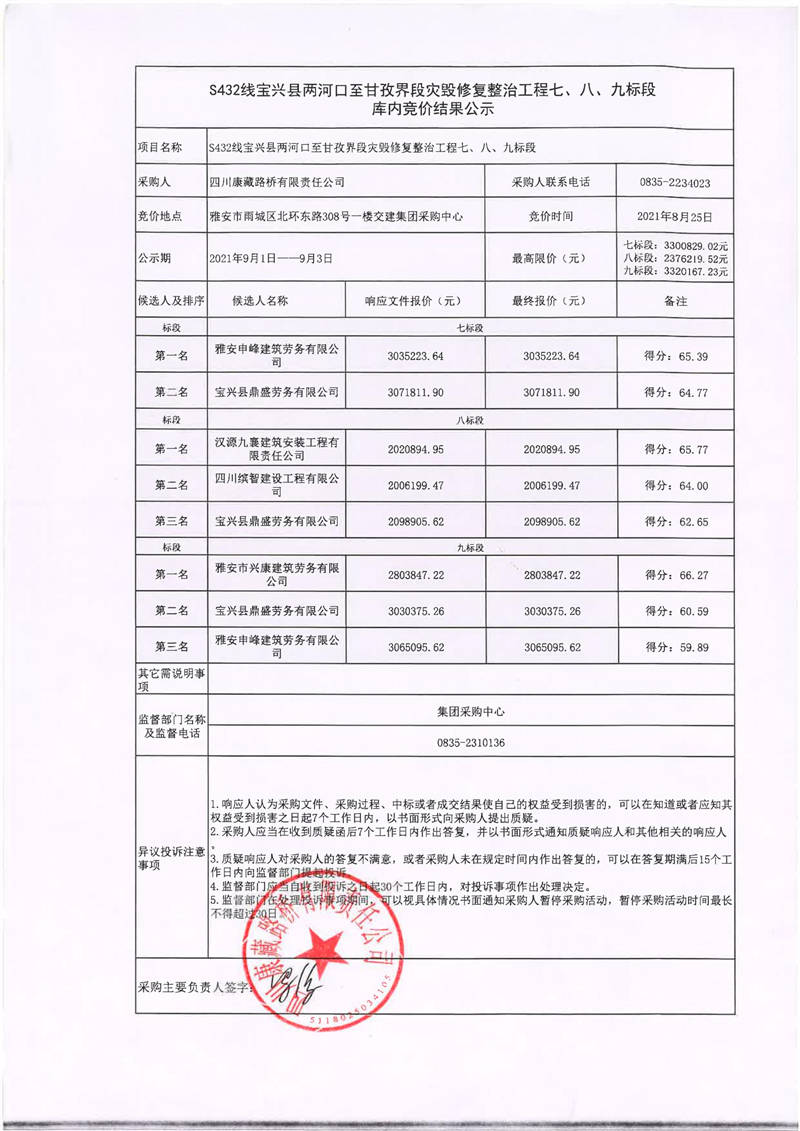四川康藏路橋有限責(zé)任公司S432線寶興縣兩河口至甘孜界段災(zāi)毀修復(fù)整治工程七、八、九標(biāo)段庫內(nèi)競價(jià)結(jié)果公示