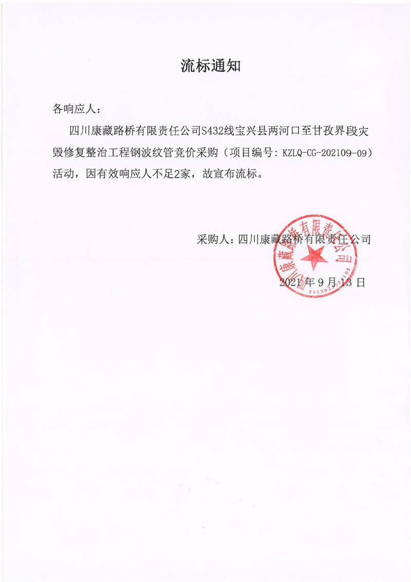 四川康藏路橋有限責任公司S432線寶興縣兩河口至甘孜界段災毀修復整治工程鋼波紋管競價采購流標通知