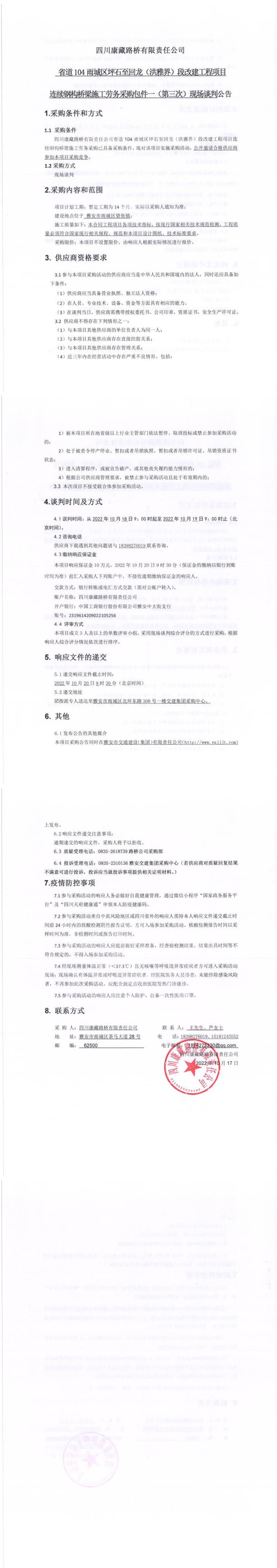 四川康藏路橋有限責(zé)任公司省道104雨城區(qū)坪石至回龍(洪雅界)段改建工程項(xiàng)目連續(xù)鋼構(gòu)橋梁施工勞務(wù)采購(gòu)包件一(第三次)現(xiàn)場(chǎng)談判公告