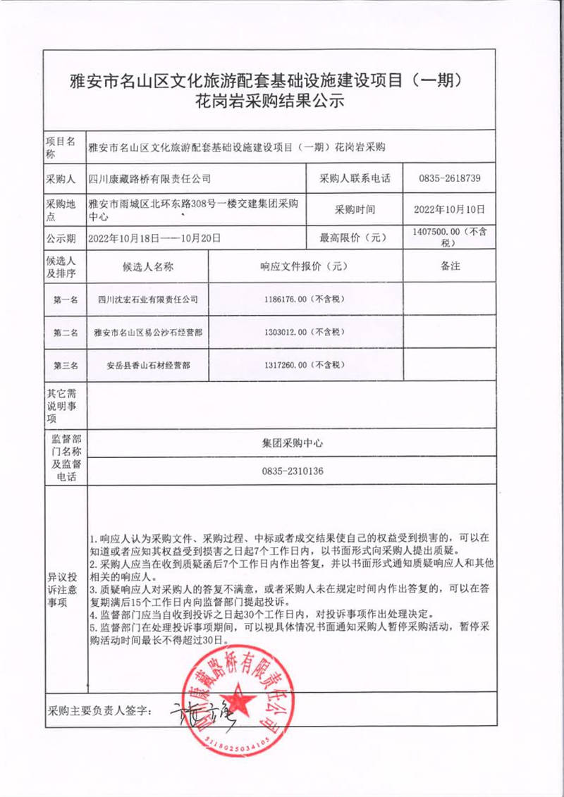 四川康藏路橋有限責(zé)任公司雅安市名山區(qū)文化旅游配套基礎(chǔ)設(shè)施建設(shè)項(xiàng)目(一期)花崗巖采購結(jié)果公示