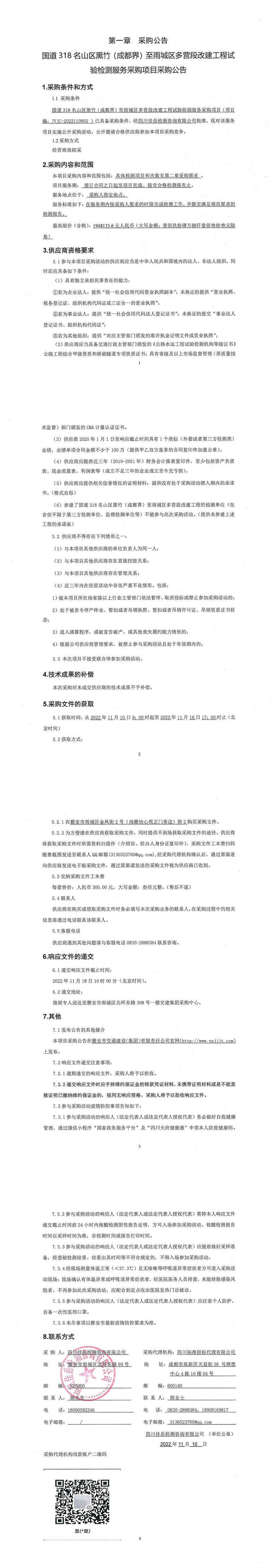 四川佳岳檢測(cè)咨詢有限公司國(guó)道318名山區(qū)黑竹(成都界)至雨城區(qū)多營(yíng)段改建工程試驗(yàn)檢測(cè)服務(wù)采購(gòu)項(xiàng)目采購(gòu)公告