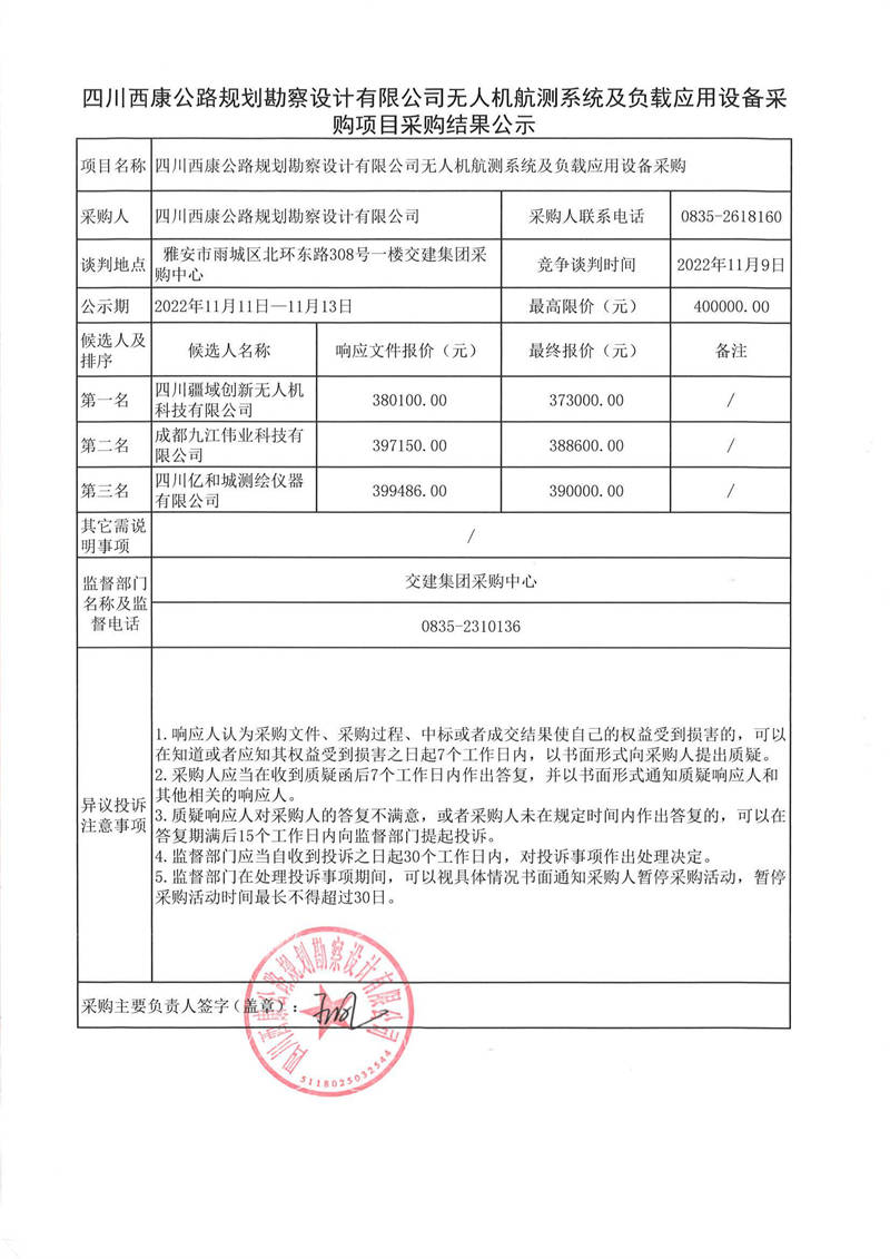 四川西康公路規(guī)劃勘察設計有限公司無人機航測系統(tǒng)及負載應用設備采購項目采購結(jié)果公示