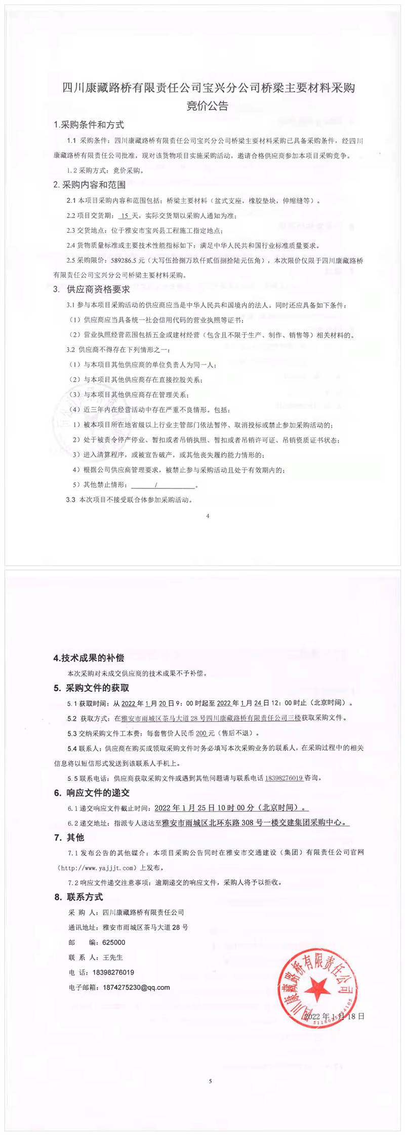 四川康藏路橋有限責(zé)任公司寶興分公司橋梁主要材料采購(gòu)競(jìng)價(jià)公告