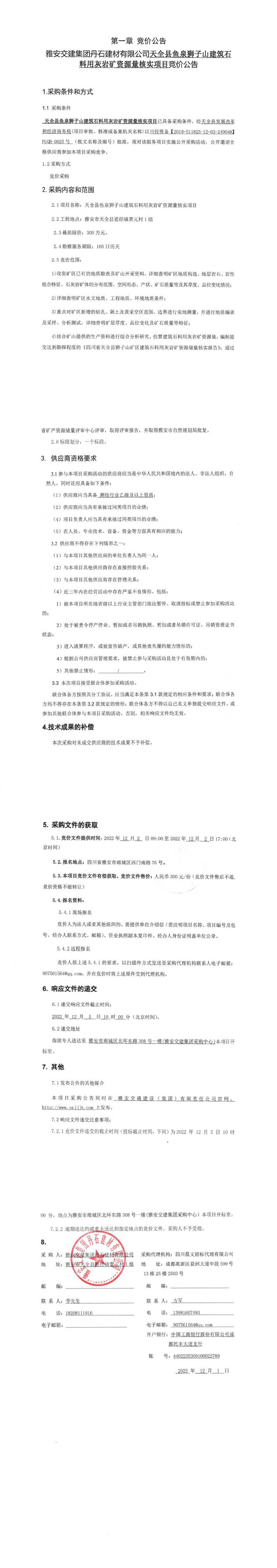 雅安交建集團(tuán)丹石建材有限公司天全縣魚(yú)泉獅子山建筑石料用灰?guī)r礦資源量核實(shí)項(xiàng)目競(jìng)價(jià)公告