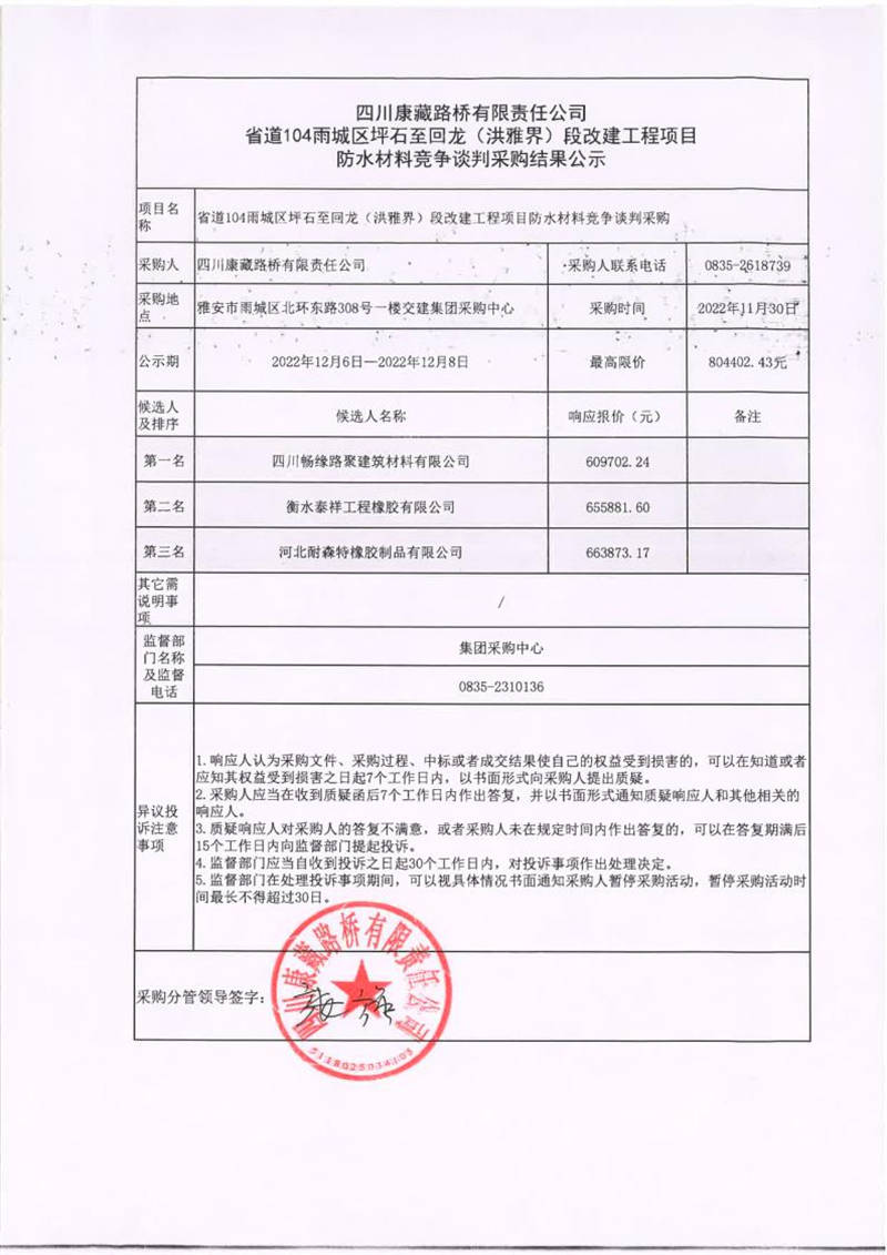 四川康藏路橋有限責任公司省道104雨城區(qū)坪石至回龍(洪雅界)段改建工程項目防水材料競爭談判采購結(jié)果公示