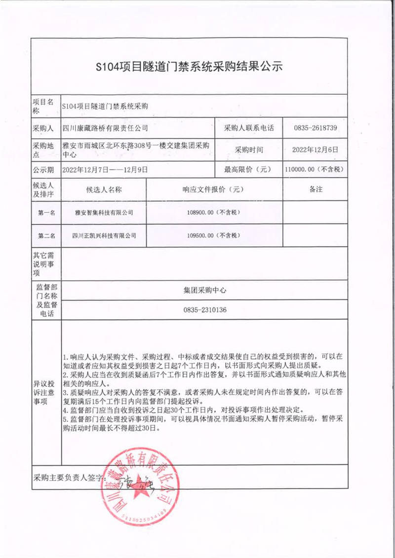 四川康藏路橋有限責(zé)任公司S104項目隧道門禁系統(tǒng)采購結(jié)果公示
