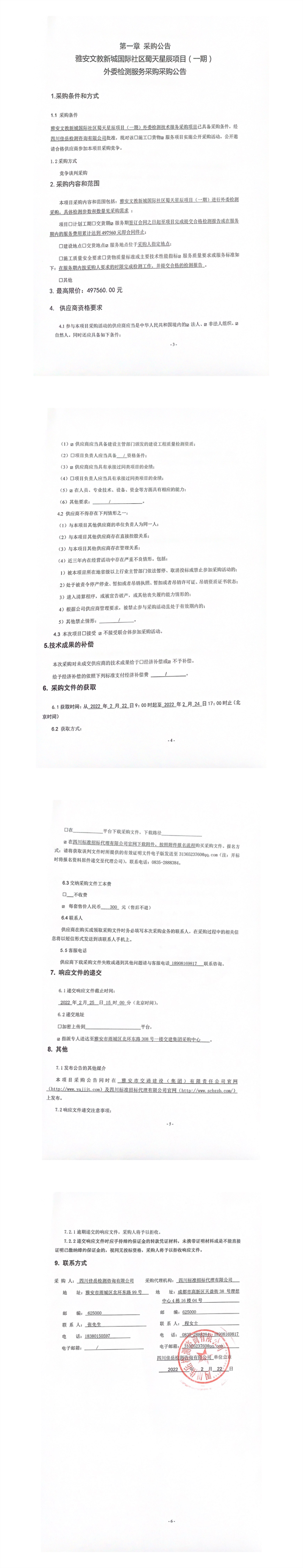 四川佳岳檢測咨詢有限公司雅安文教新城國際社區(qū)蜀天星辰項目(一期)外委檢測服務(wù)采購采購公告