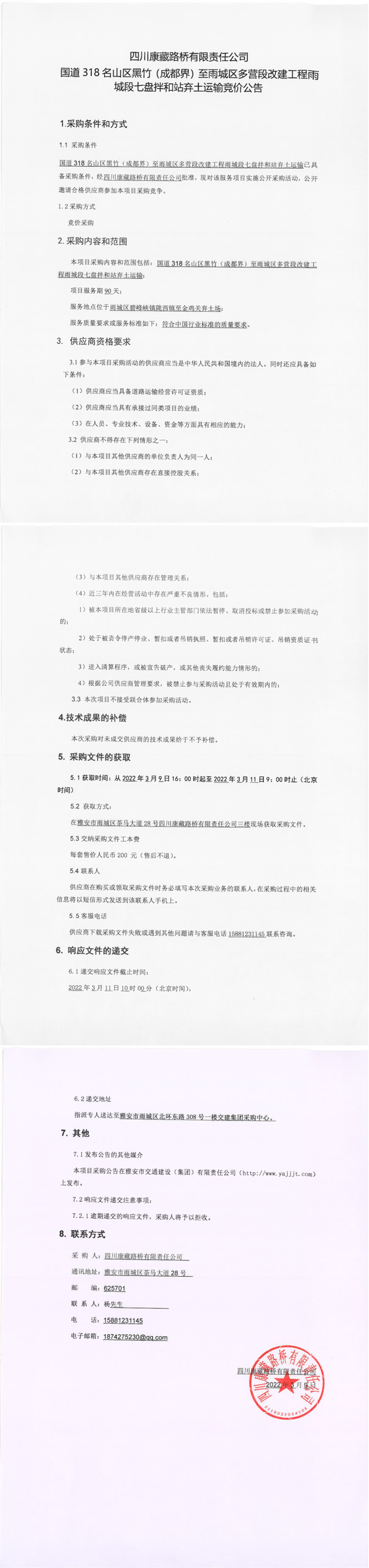 四川康藏路橋有限責(zé)任公司國道318名山區(qū)黑竹(成都界)至雨城區(qū)多營段改建工程雨城段七盤拌和站棄土運(yùn)輸競(jìng)價(jià)公告