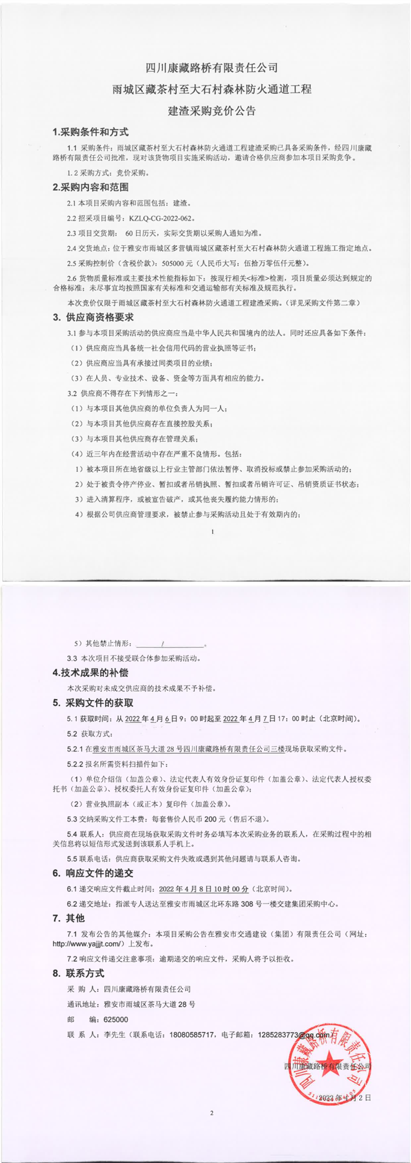四川康藏路橋有限責任公司雨城區(qū)藏茶村至大石村森林防火通道工程建渣采購競價公告