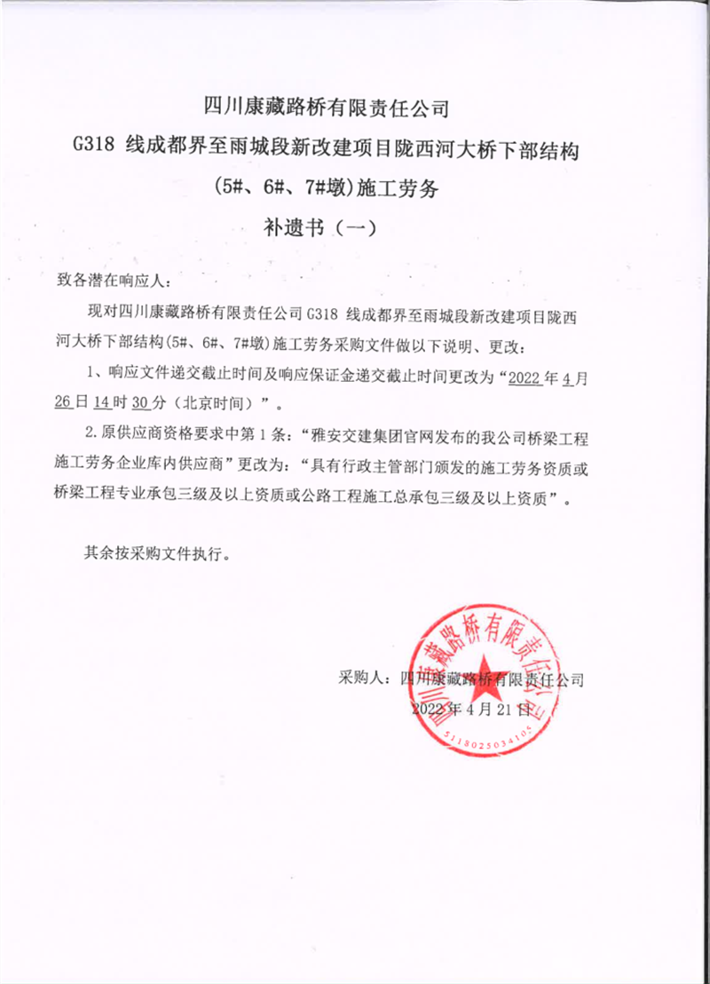 四川康藏路橋有限責任公司G318線成都界至雨城段新改建項目隴西河大橋下部結構(5#、6#、7#墩)施工勞務補遺書(一)