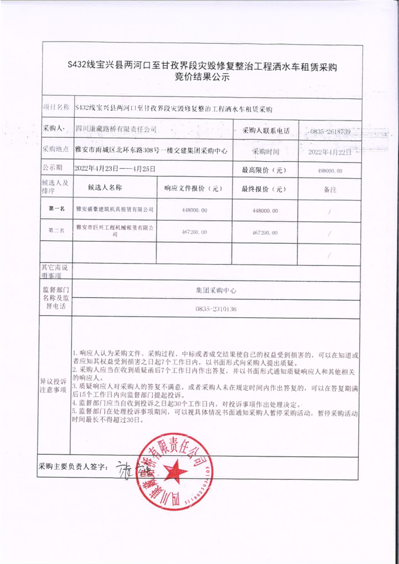 四川康藏路橋有限責(zé)任公司S432線寶興縣兩河口至甘孜界段災(zāi)毀修復(fù)整治工程灑水車租賃采購競(jìng)價(jià)結(jié)果公示