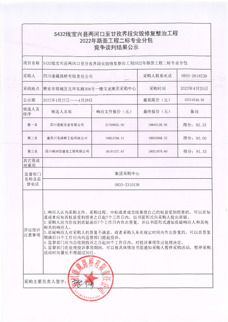 四川康藏路橋有限責任公司S432線寶興縣兩河口至甘孜界段災毀修復整治工程2022年路面工程二標專業(yè)分包競爭談判結果公示