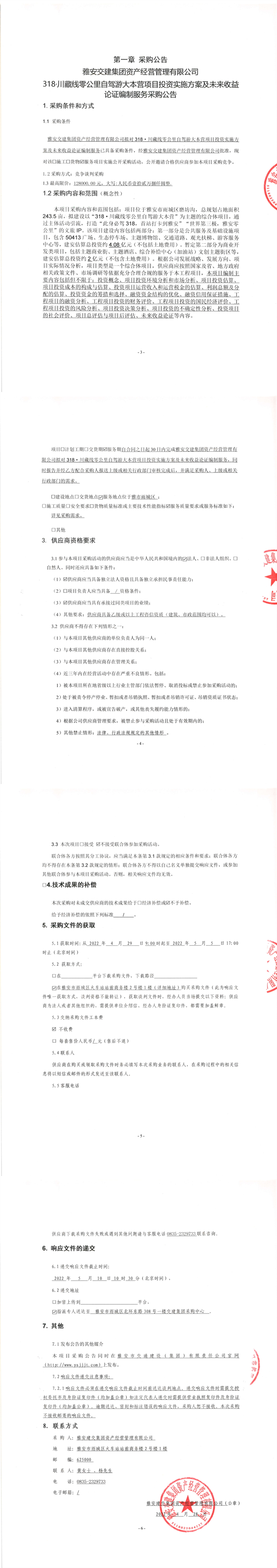 雅安交建集團(tuán)資產(chǎn)經(jīng)營管理有限公司318·川藏線零公里自駕游大本營項(xiàng)目投資實(shí)施方案及未來收益論證編制服務(wù)采購公告