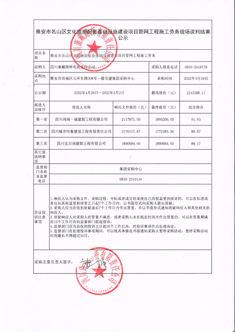 四川康藏路橋有限責(zé)任公司雅安市名山區(qū)文化旅游配套基礎(chǔ)設(shè)施建設(shè)項(xiàng)目管網(wǎng)工程施工勞務(wù)現(xiàn)場談判結(jié)果公示
