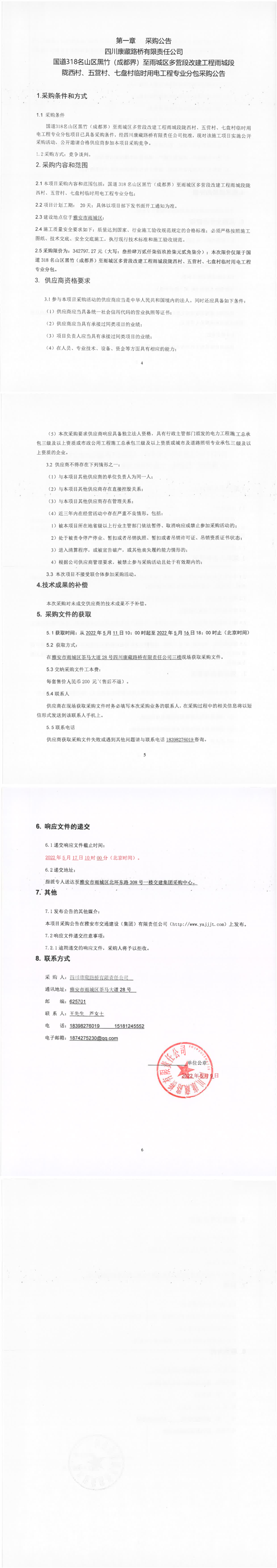 四川康藏路橋有限責(zé)任公司G318線成都界至雨城段新改建項目名山段臨時用電工程專業(yè)分包采購公告