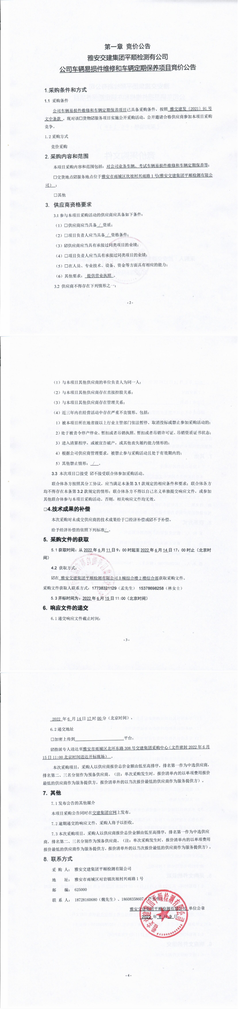 雅安交建集團(tuán)平順檢測(cè)有限公司公司車輛易損件維修和車輛定期保養(yǎng)項(xiàng)目競(jìng)價(jià)公告