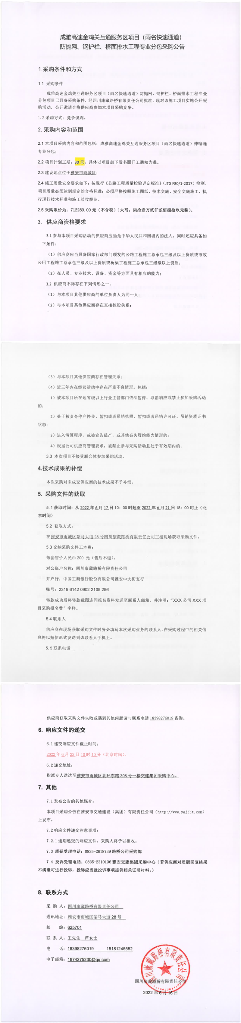 四川康藏路橋有限責(zé)任公司成雅高速金雞關(guān)互通服務(wù)區(qū)項(xiàng)目(雨名快速通道)防拋網(wǎng)、鋼護(hù)欄、橋面排水工程專業(yè)分包采購(gòu)公告
