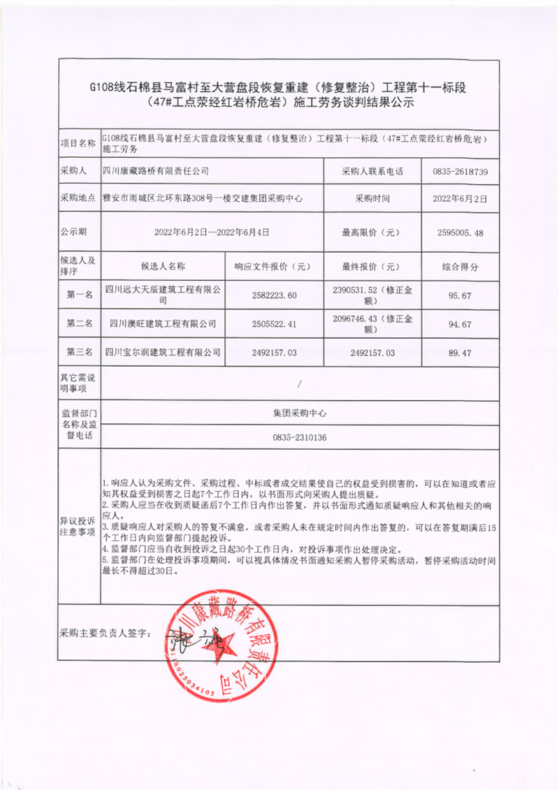 四川康藏路橋有限責(zé)任公司G108線石棉縣馬富村至大營(yíng)盤段恢復(fù)重建(修復(fù)整治)工程第十一標(biāo)段(47#工點(diǎn)滎經(jīng)紅巖橋危巖)施工勞務(wù)談判結(jié)果公示