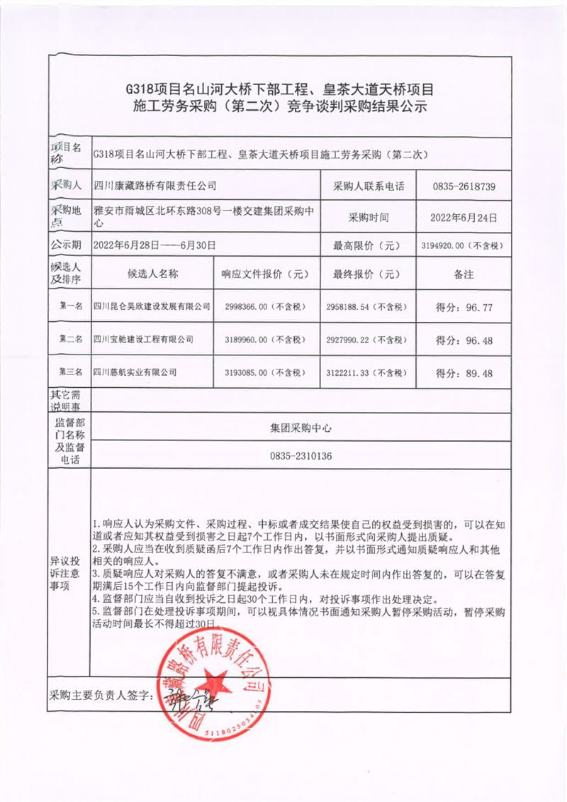 四川康藏路橋有限責(zé)任公司G318項(xiàng)目名山河大橋下部工程、皇茶大道天橋項(xiàng)目施工勞務(wù)采購(第二次)競爭談判采購結(jié)果公示