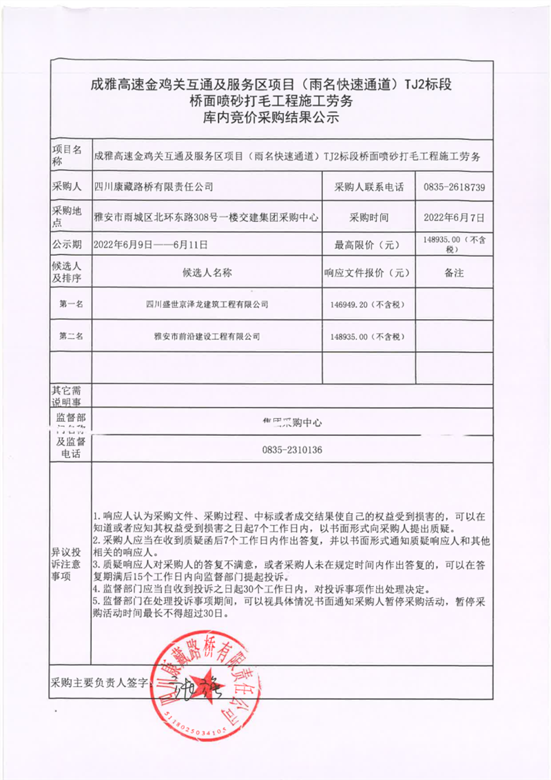 四川康藏路橋有限責(zé)任公司成雅高速金雞關(guān)互通服務(wù)區(qū)項(xiàng)目(雨名快速通道)TJ2標(biāo)段橋面噴砂打毛工程施工勞務(wù)庫內(nèi)競價采購結(jié)果公示