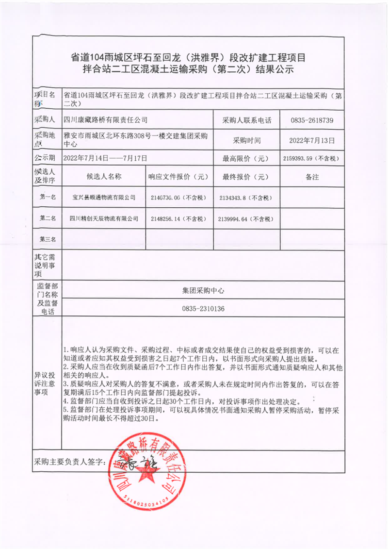 四川康藏路橋有限責(zé)任公司省道104線雨城區(qū)坪石至回龍(洪雅界)段改擴(kuò)建工程項(xiàng)目拌合站二工區(qū)混凝土運(yùn)輸采購(gòu)(第二次)結(jié)果公示
