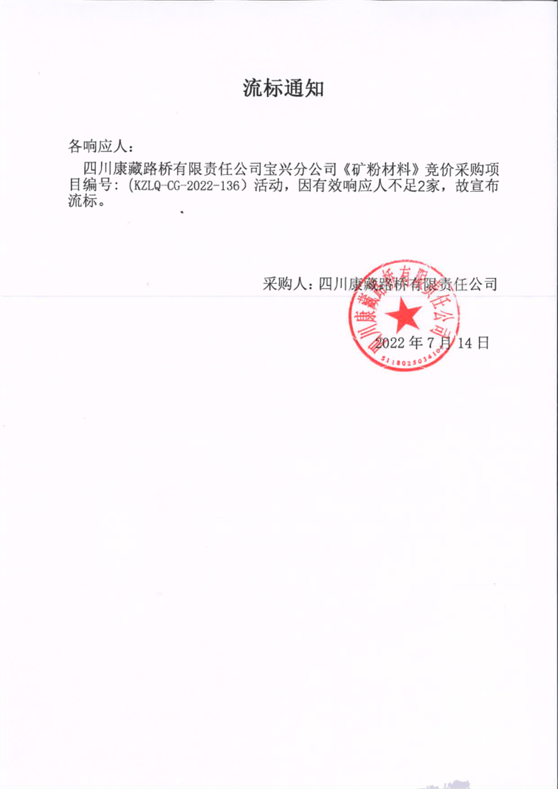 四川康藏路橋有限責任公司寶興分公司礦粉材料采購流標通知