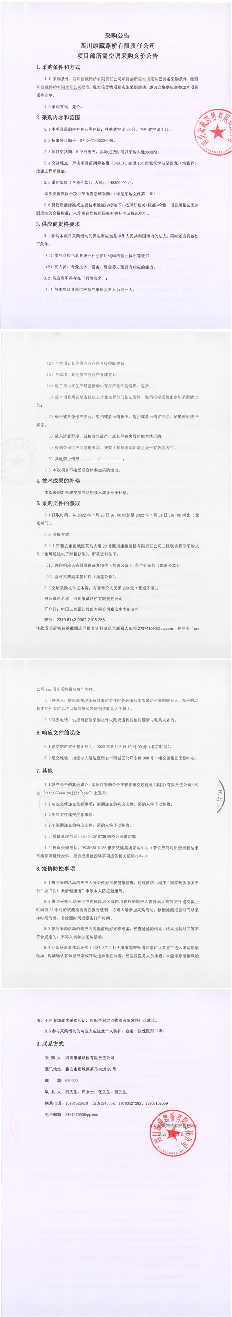 四川康藏路橋有限責(zé)任公司項(xiàng)目部所需空調(diào)采購競價(jià)公告