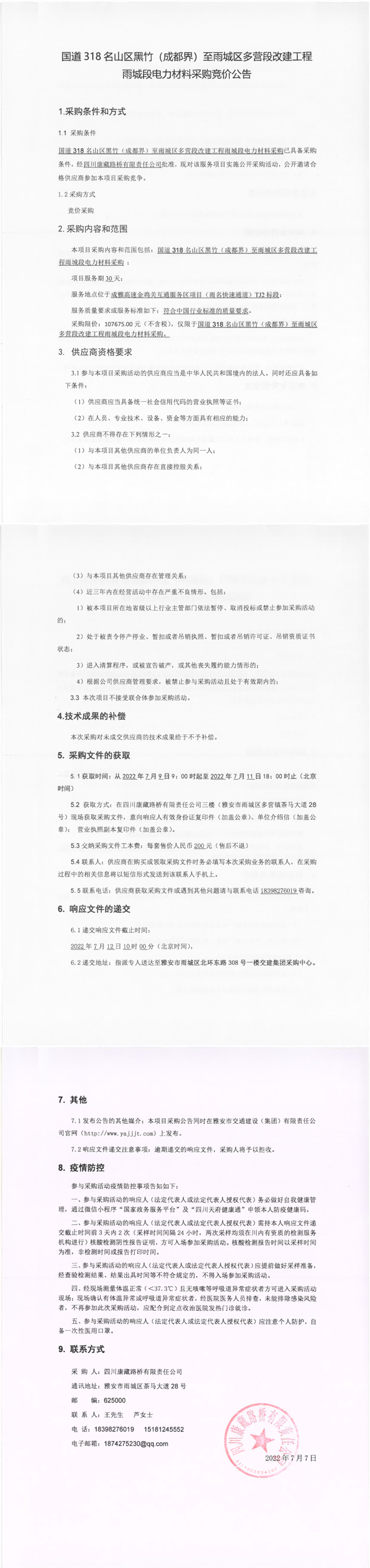 四川康藏路橋有限責(zé)任公司國(guó)道318名山區(qū)黑竹(成都界)至雨城區(qū)多營(yíng)段改建工程雨城段電力材料采購競(jìng)價(jià)公告
