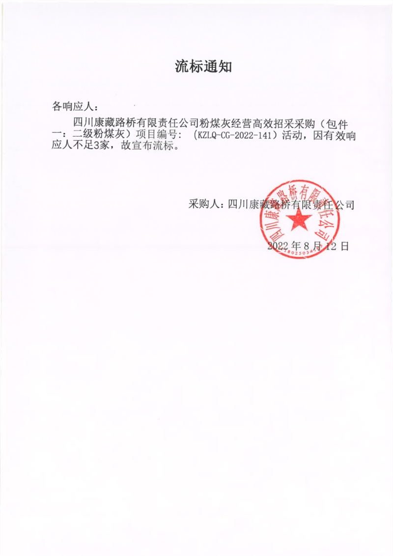 四川康藏路橋有限責(zé)任公司粉煤灰經(jīng)營高效招采采購(包件一:二級粉煤灰)流標通知