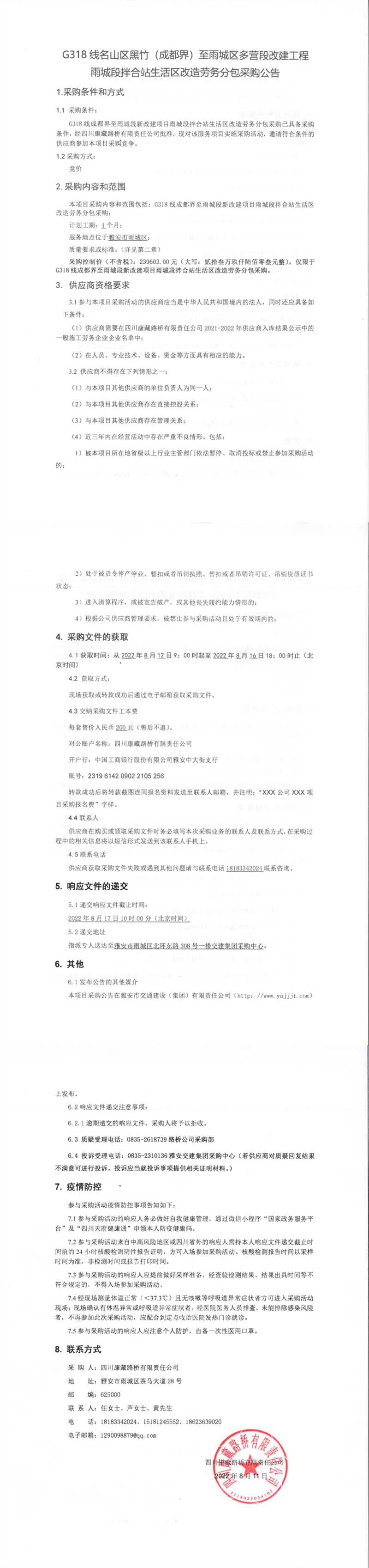 四川康藏路橋有限責(zé)任公司G318線名山區(qū)黑竹(成都界)至雨城區(qū)多營段改建工程雨城段拌合站生活區(qū)改造勞務(wù)分包采購公告