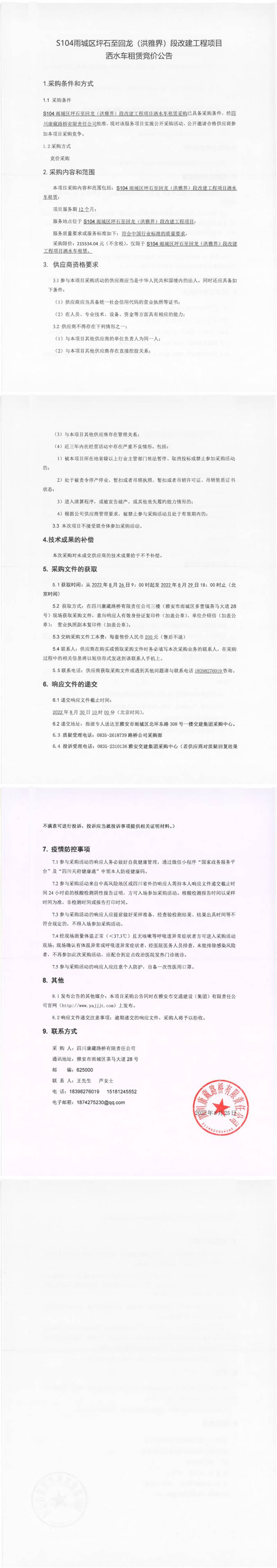 四川康藏路橋有限責(zé)任公司S104雨城區(qū)坪石至回龍(洪雅界)段改建工程項(xiàng)目灑水車租賃競價(jià)公告