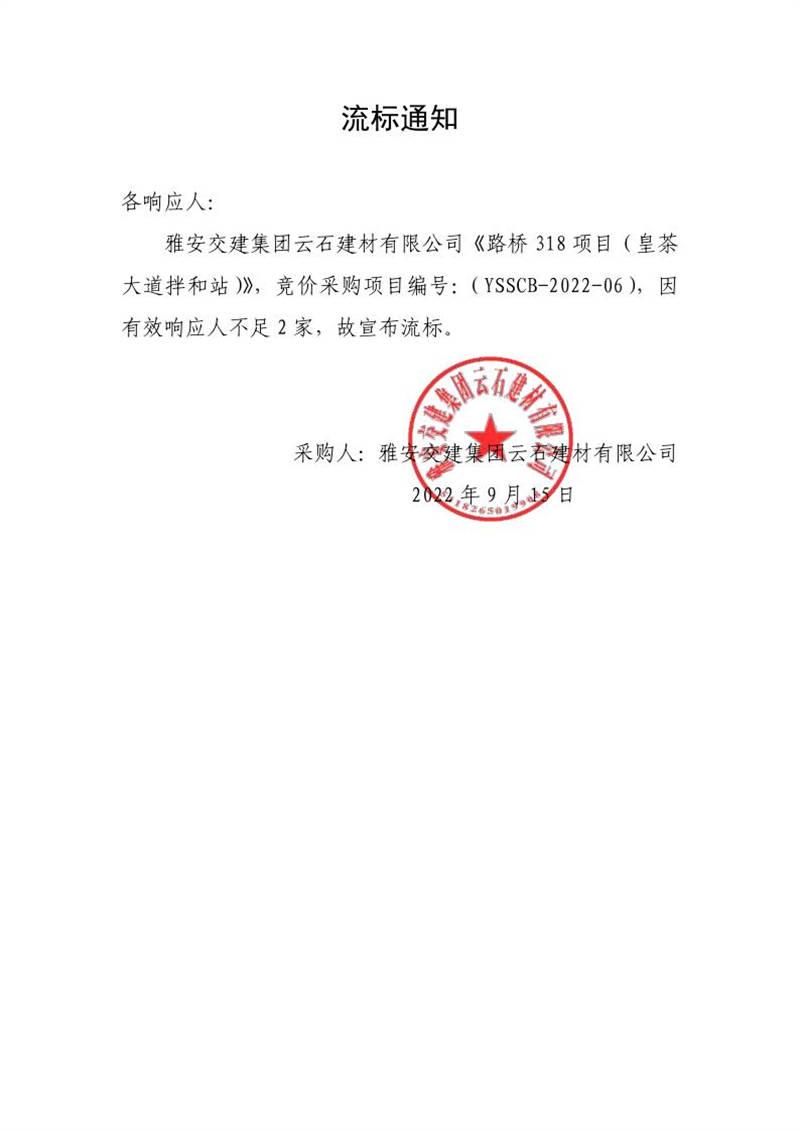雅安交建集團云石建材有限公司成品料運輸服務采購(皇茶大道拌和站)流標通知