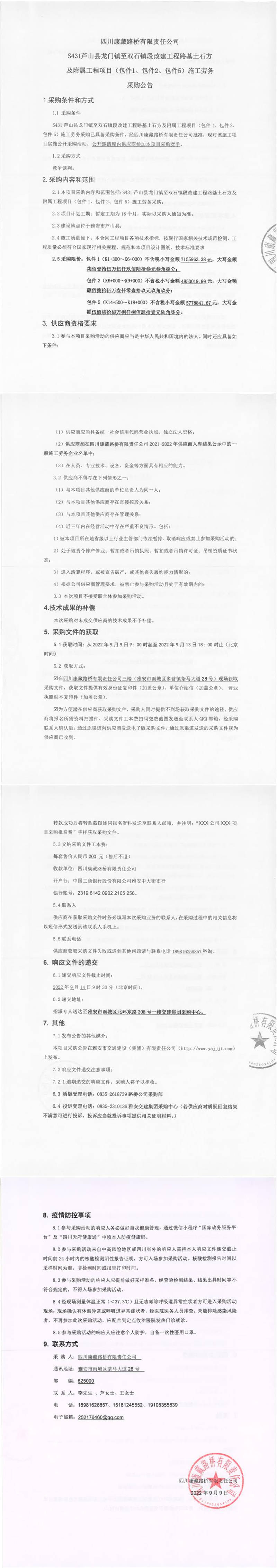 四川康藏路橋有限責(zé)任公司S431蘆山縣龍門鎮(zhèn)至雙石段改建工程路基土石方及附屬工程項(xiàng)目(包件1、包件2、包件5)施工勞務(wù)采購(gòu)公告