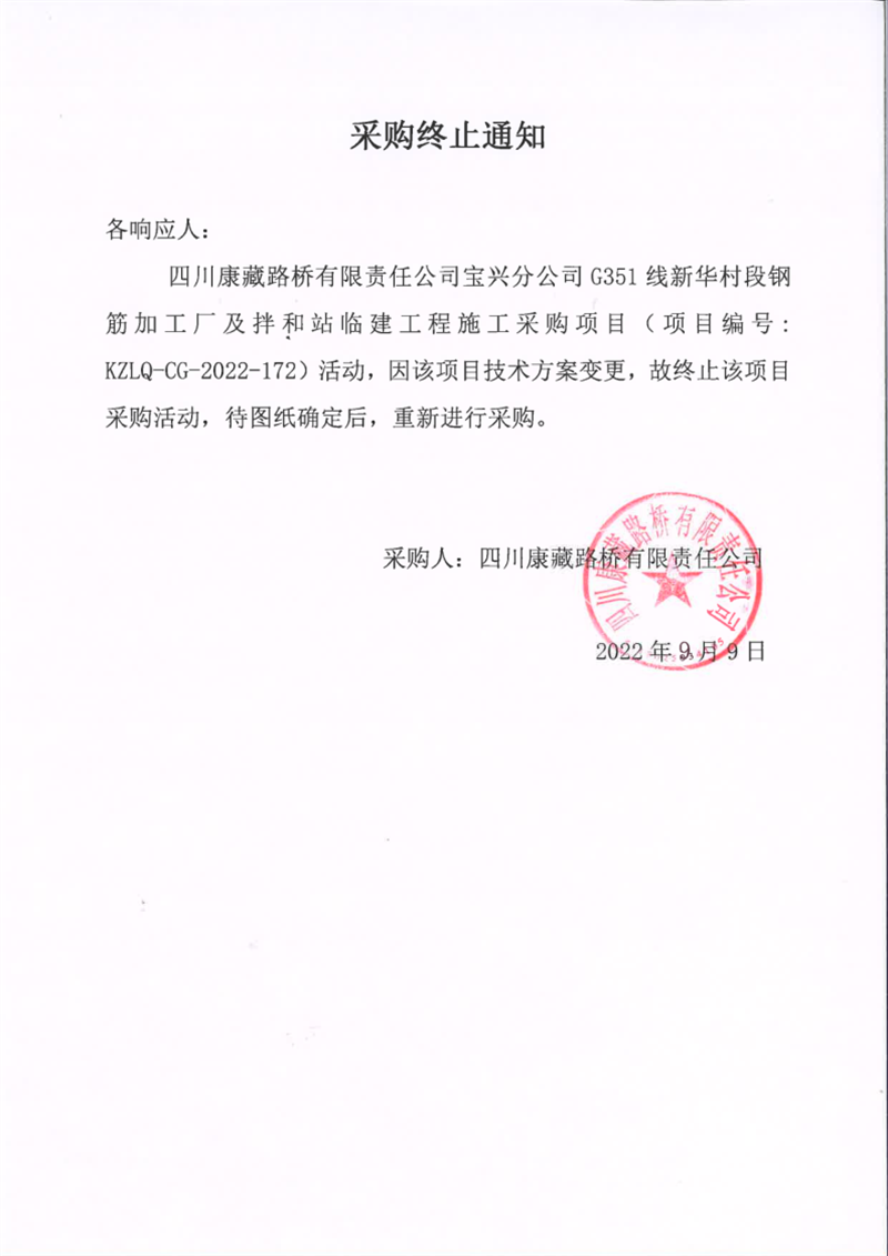 四川康藏路橋有限責(zé)任公司寶興分公司G351線新華村段鋼筋加工廠及拌合站臨建工程施工采購項目采購終止通知