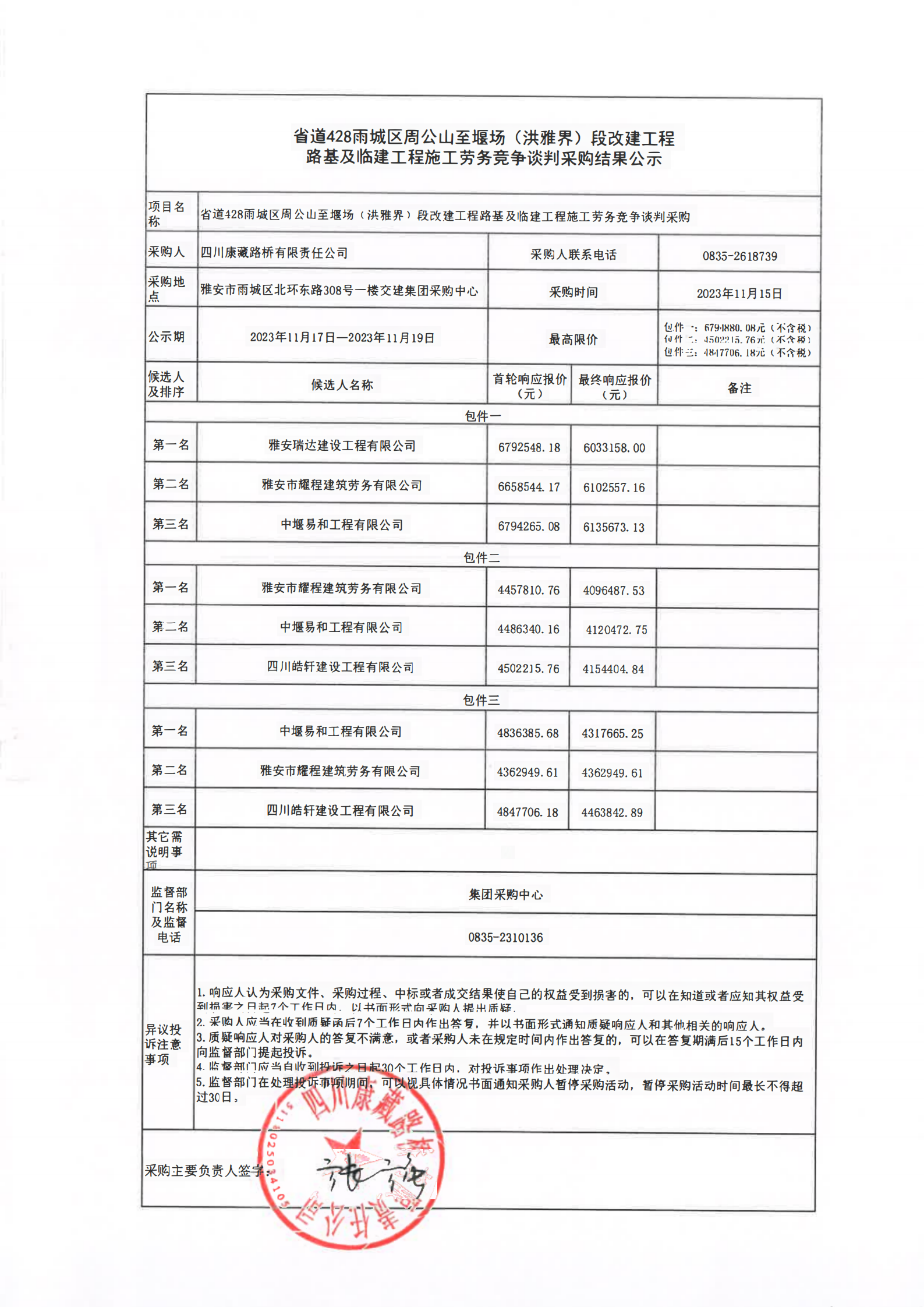 四川康藏路橋有限責任公司省道428雨城區(qū)周公山至堰場(洪雅界)段改建工程路基及臨建工程施工勞務競爭談判采購結果公示