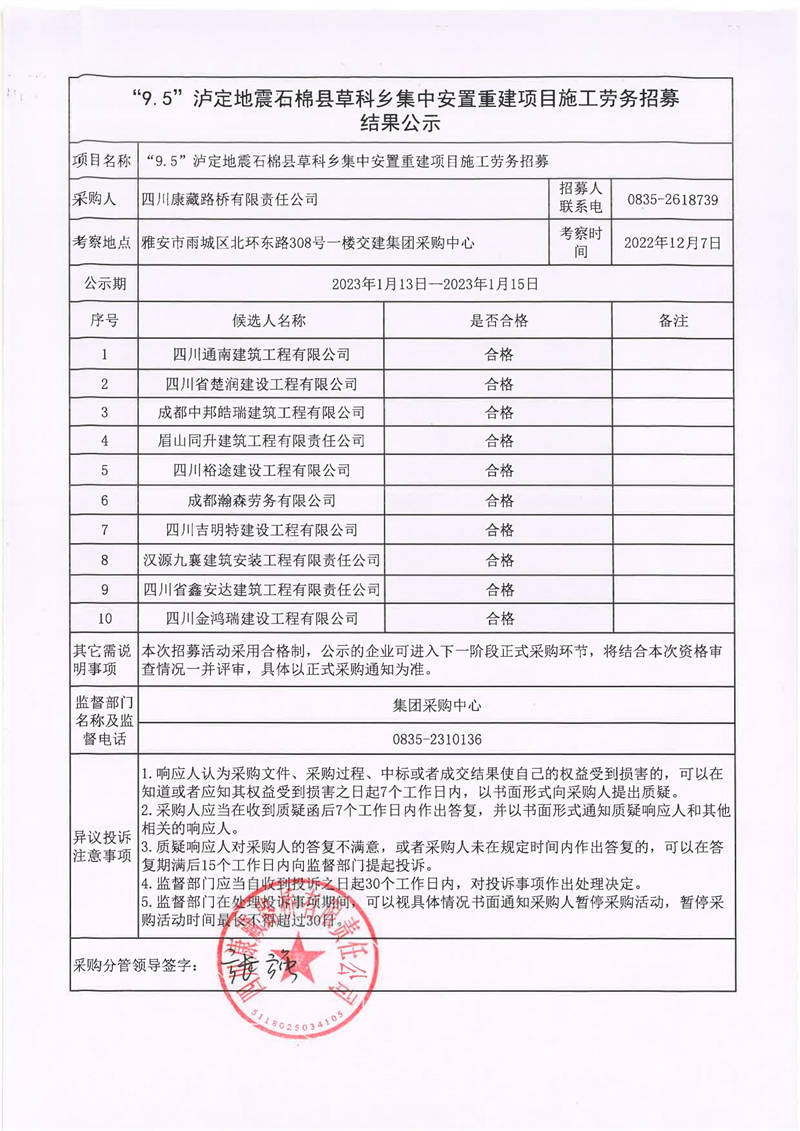 四川康藏路橋有限責(zé)任公司“9.5”瀘定地震石棉縣草科鄉(xiāng)集中安置重建項目施工勞務(wù)招募結(jié)果公示