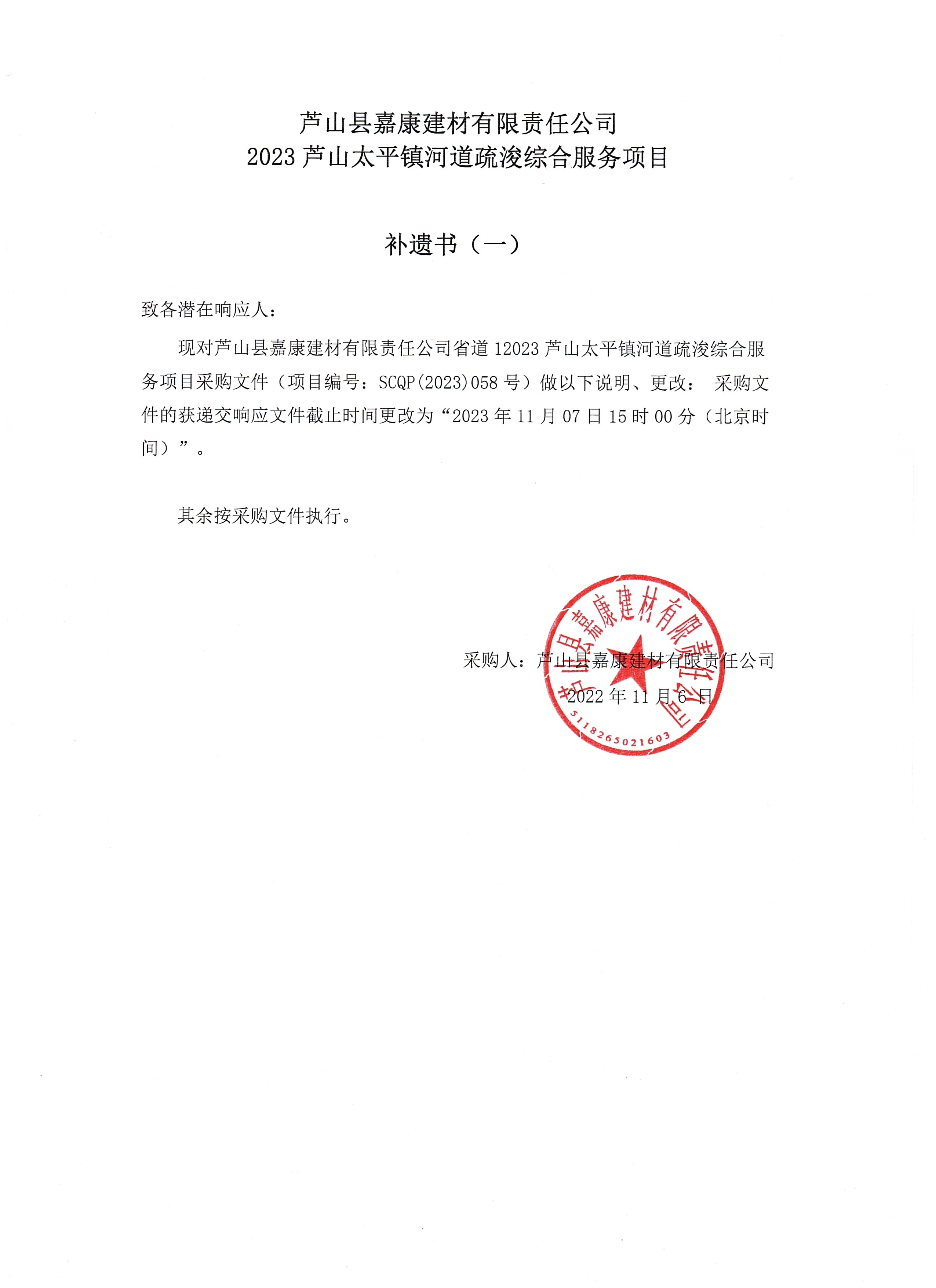 蘆山縣嘉康嘉康建材有限責(zé)任公司2023蘆山太平鎮(zhèn)河道疏浚綜合服務(wù)項(xiàng)目補(bǔ)遺書(shū)(一)