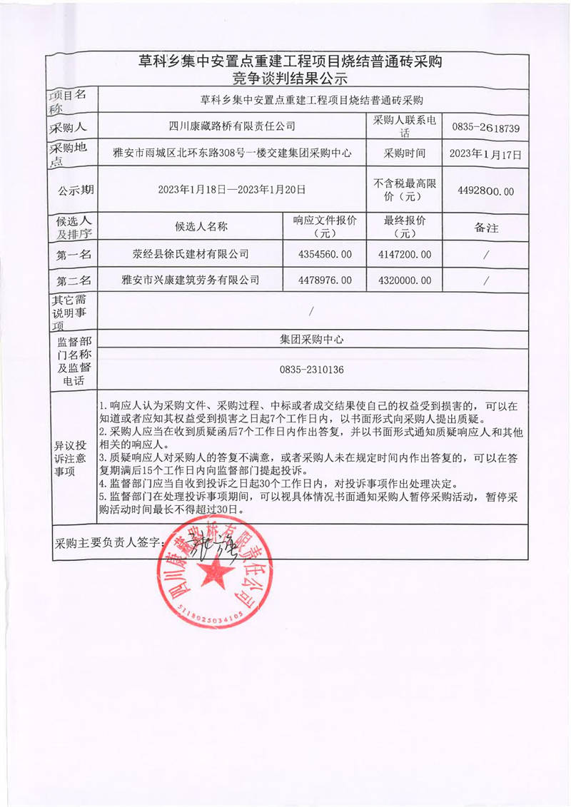 四川康藏路橋有限責任公司草科鄉(xiāng)集中安置點重建工程項目燒結(jié)普通磚采購競爭談判結(jié)果公示